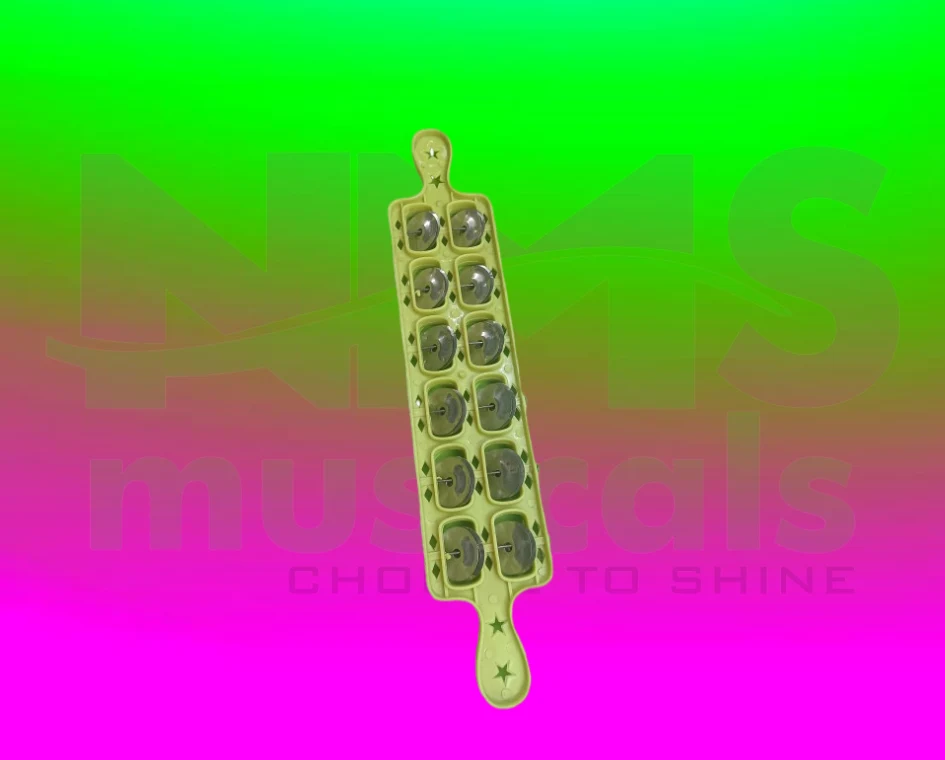 - Fiber Jheeka 6 Lines – Yellow Colour is a traditional Indian hand percussion instrument crafted from lightweight fiber material, featuring multiple rows of jingles that produce a crisp, rhythmic sound when shaken.